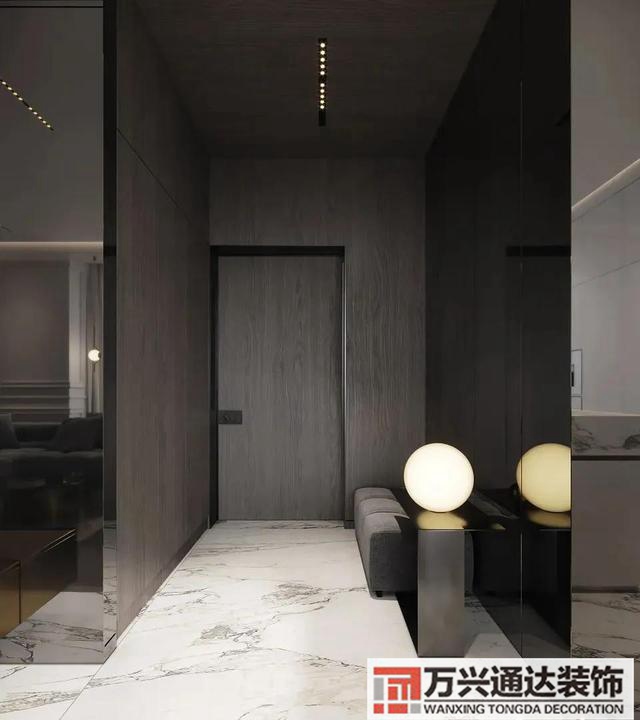 ▲玄关的墙面以灰木色的木饰面包围,布置一张布艺长板凳作为换鞋凳+小茶几,小茶几上布置球形小台灯,让空间显得格外的创意端庄而舒适。