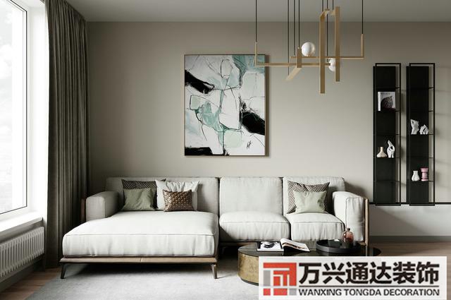 客厅整体简洁无累赘,浅纯色背景配合米色沙发为空点定下舒缓情调,让人轻奢惬意。